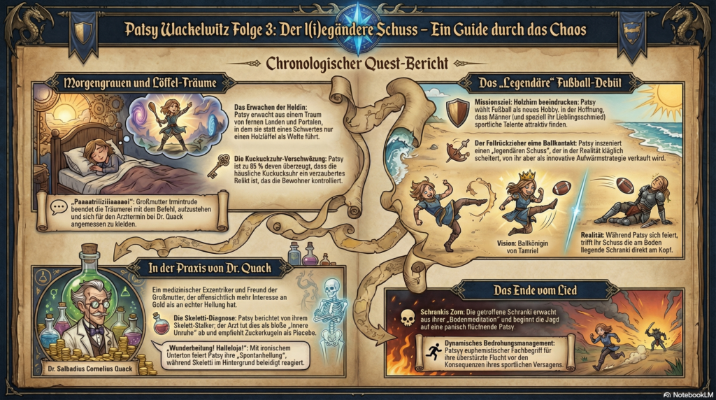 Mit scharfem Humor, absurden Dialogen und viel Liebe zum Detail nimmt diese Folge den Alltag aufs Korn – vom Arztzimmer bis zum Fußballplatz. Und ja, auch eine sehr spezielle Trainingsszene ist dabei, inklusive Kommentator, Übertreibung und dem Gefühl, dass hier gerade Sportgeschichte geschrieben wird. Oder zumindest Fernsehgeschichte.